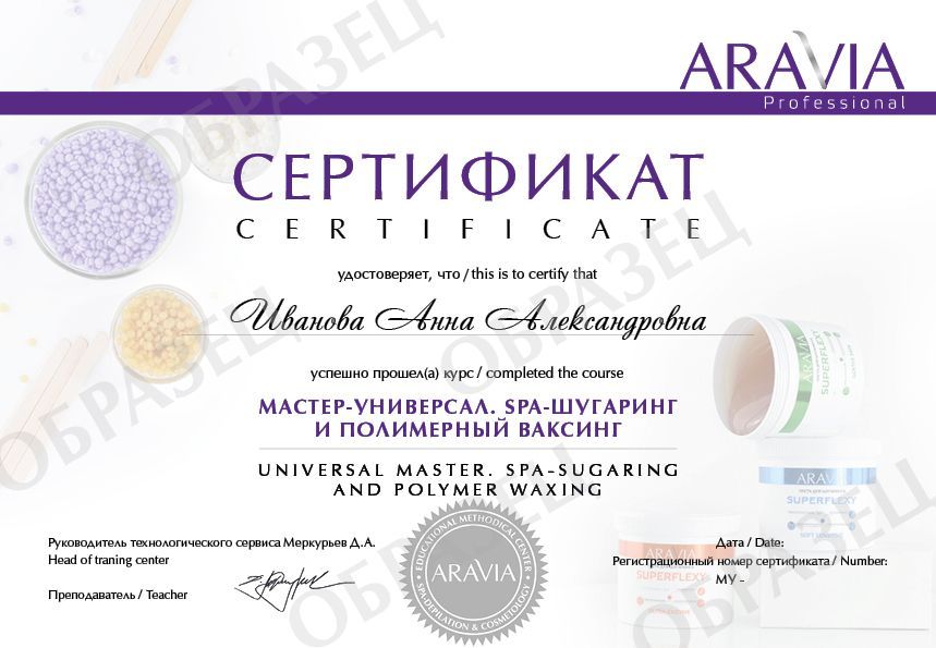 После прохождения курса участники получат специальную скидку на продукцию ARAVIA Professional до 40%, методическое пособие «SPA-шугаринг и полимерный ваксинг ARAVIA Professional» и именной сертификат, подтверждающий квалификацию мастера шугаринга: